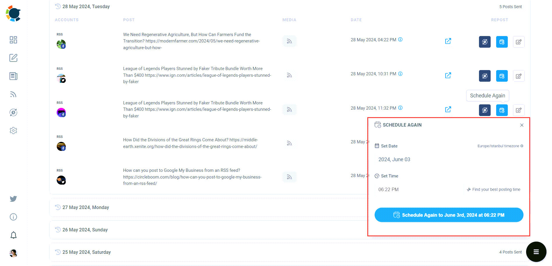 You can choose between the following: “Post to Queue”, “Schedule Again”, and “Edit Post”.