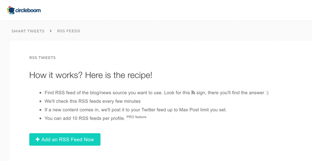 Presuming you’re on Twitter, your aim is adding your webpage’s RSS feed to your Twitter account and then driving traffic to your webpage via your Twitter account(s) automatically. You can easily connect your webpage/blog RSS feed to your Twitter account with Circleboom’s Smart Tweet module in a just few steps. After setting up, every time your webpage is updated with a new post, your Twitter feed will be auto-updated too.