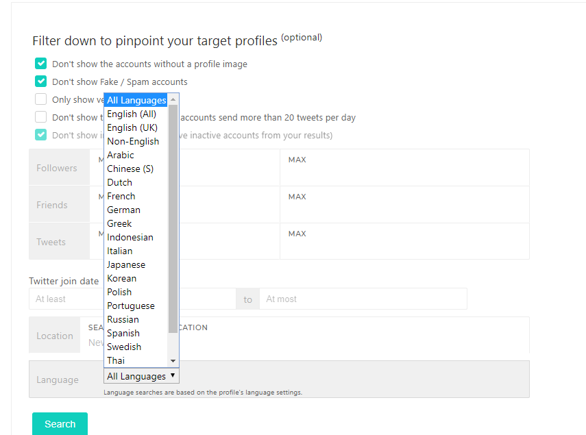 - Follower numbers: Enter the min-max follower numbers of the Twitter accounts you’re looking for.