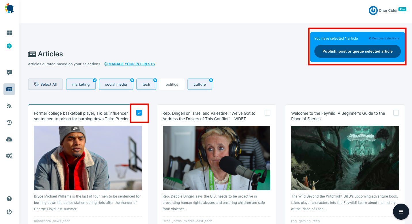Once you select your interest topics, Circleboom will curate a list of articles related to your interests. You can easily add your favorite articles to your Twitter queue.