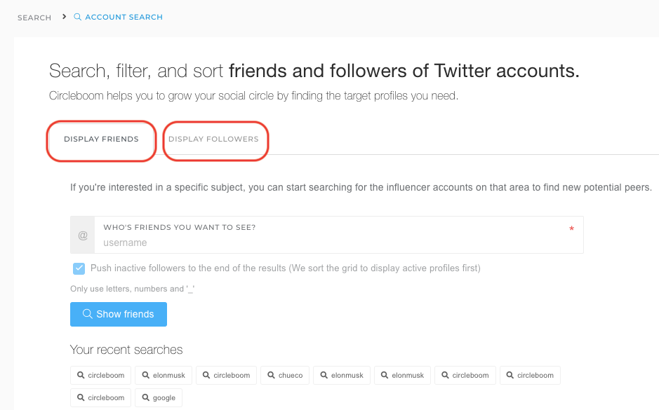 You can search particular Twitter accounts to get the lists of the friends and followers of this particular account you searched for.