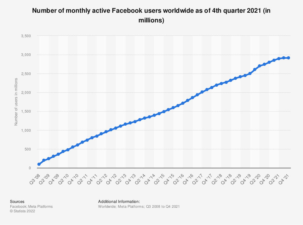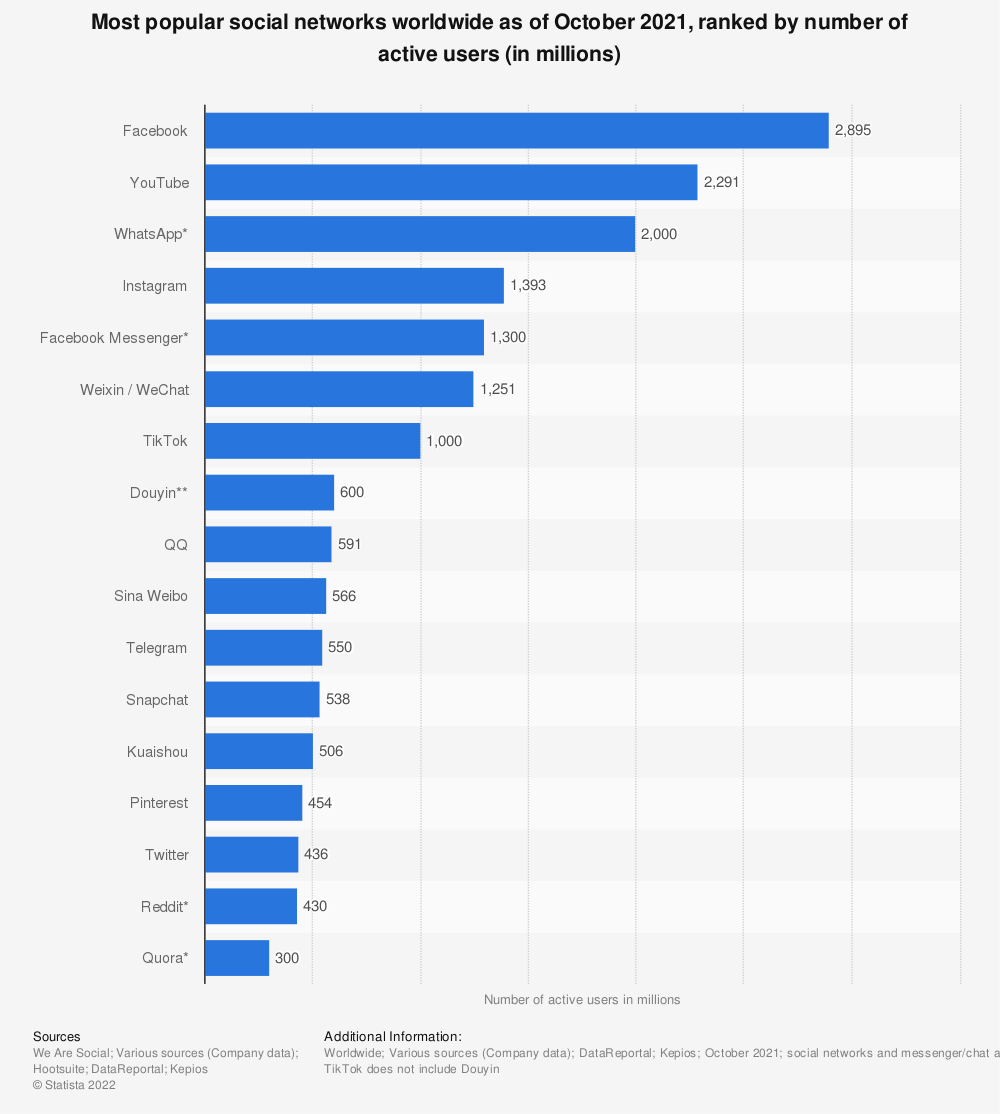 Facebook has the most significant number of social users, having approximately 2.91 billion monthly active users as the third quarter of 2021.