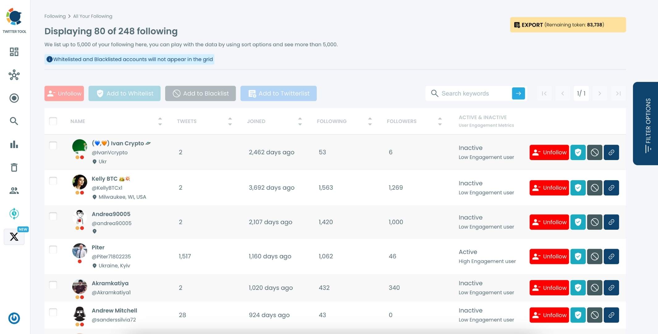 Step #2: Circleboom will list all of your inactive followers! You can select all or some of them and "unfollow" in bulk with one click if you wish!