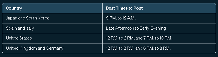 - United Kingdom: Posting between 6 PM and 8 PM GMT (Greenwich Mean Time) on weekdays is a good bet, as people often check their phones after work or school. Weekends may see more activity during the late morning to early afternoon.